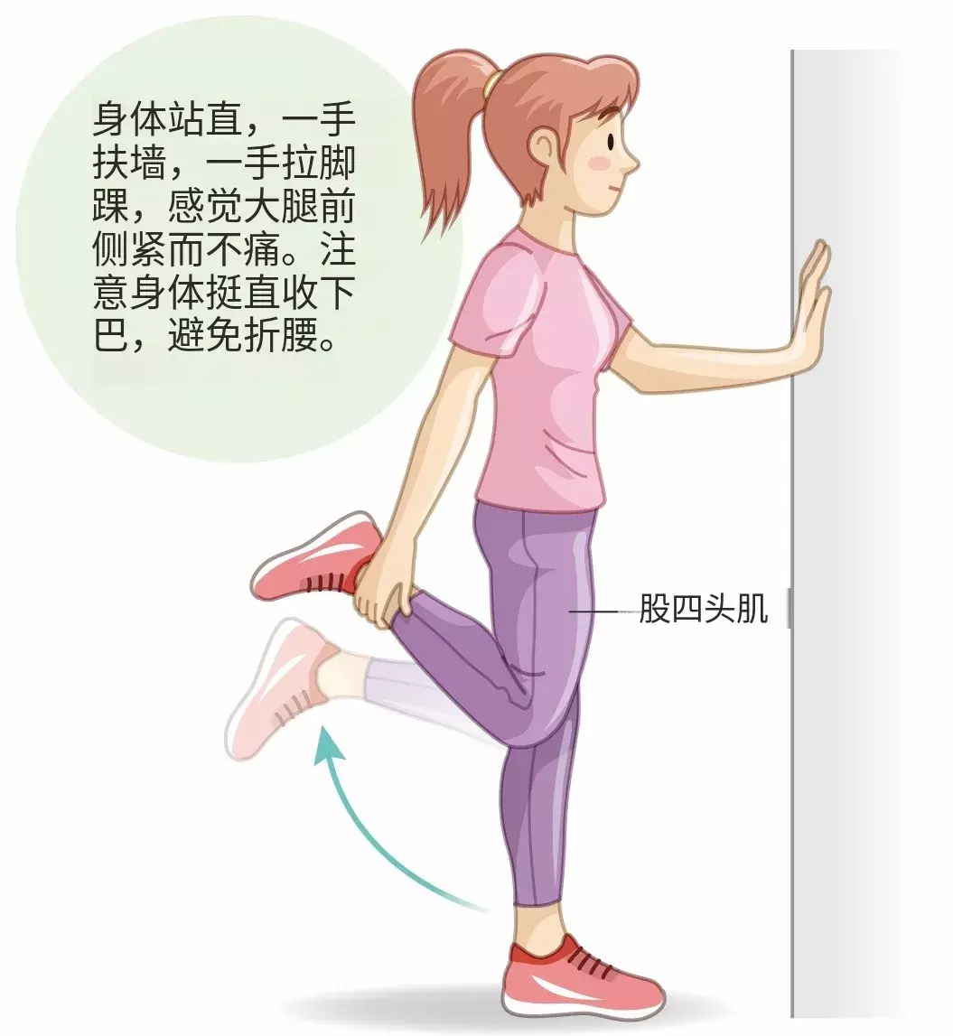 站立,单手扶墙或椅背保持平衡。弯曲一侧膝盖,用手抓住同侧脚踝,轻轻将脚跟拉向臀部。感受大腿前侧的拉伸感,保持 20~30 秒,换边。重复 2~3 次。注意:保持骨盆中立避免腰部过度反弓。